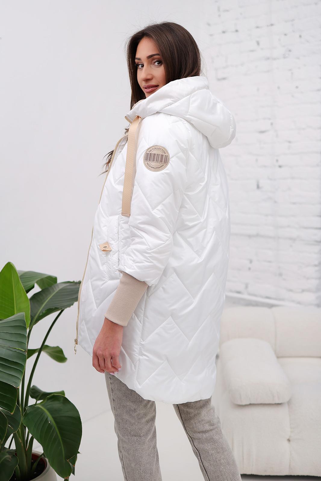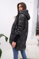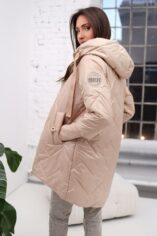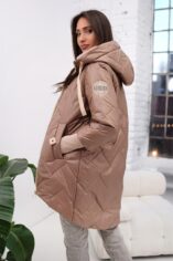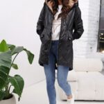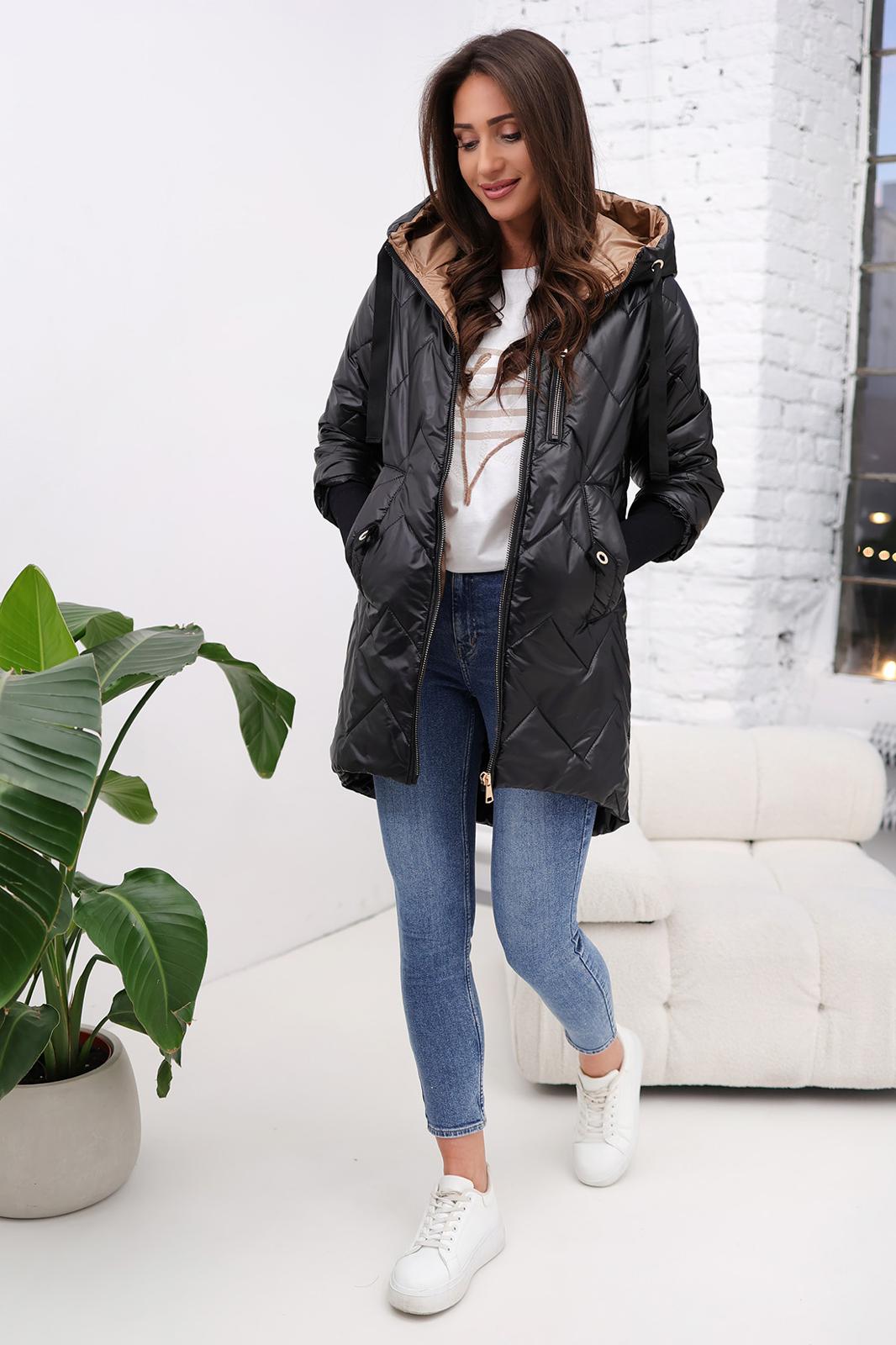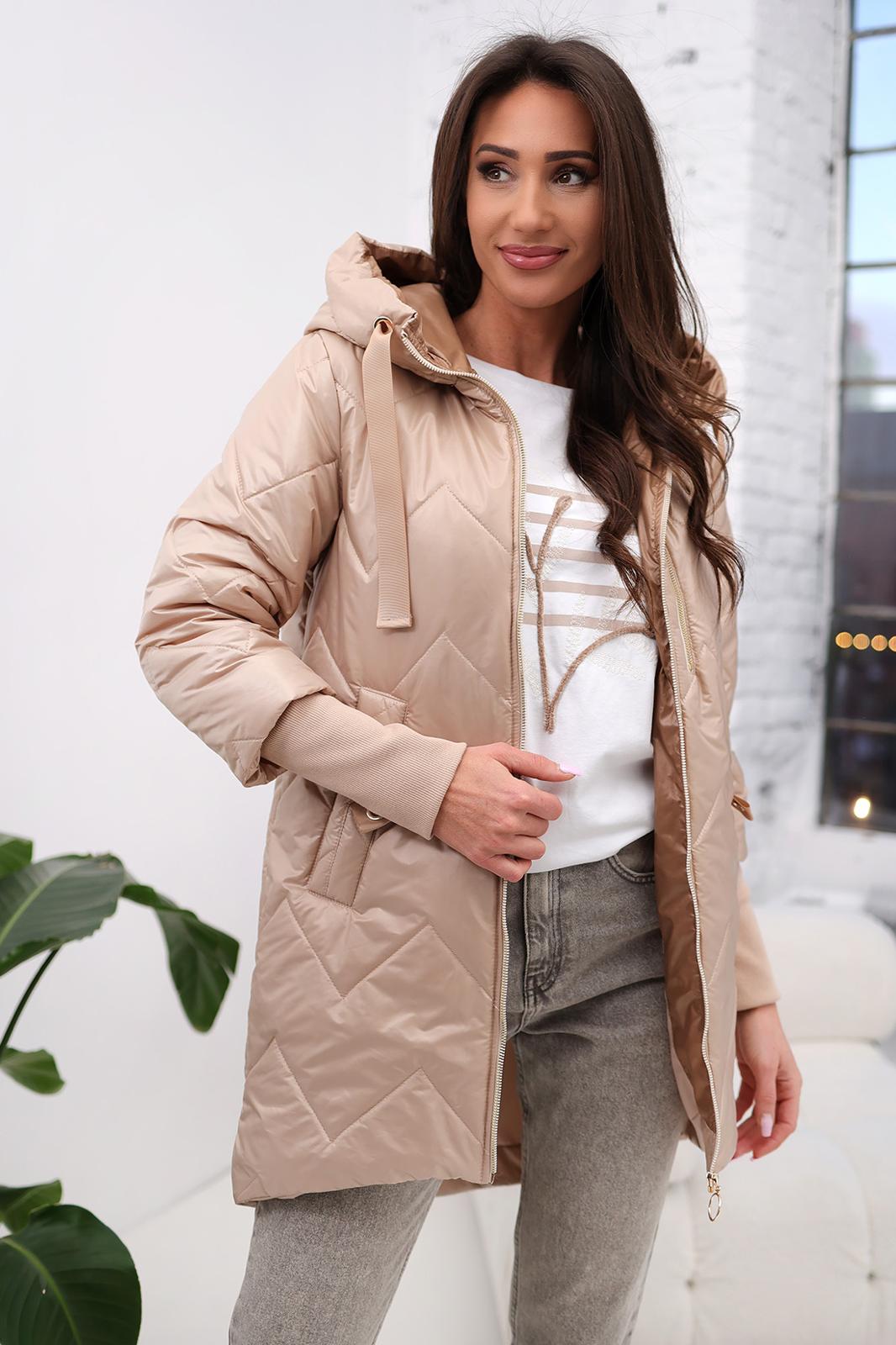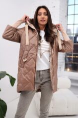 Model lekko asymetryczny (tył wydłużony) wyszczupla i wydłuża sylwetkę. Pikowany wzór w kształcie szewronu nadaje kurtce nowoczesnego charakteru. Obszerny, regulowany kaptur zapewnia dodatkową ochronę przed wiatrem i deszczem, a także można go regulować za pomocą troczków. Po bokach głębokie praktyczne kieszenie z pięknymi ozdobami. Rękawy zakończone długimi mankietami z miękkiego ściągacza.